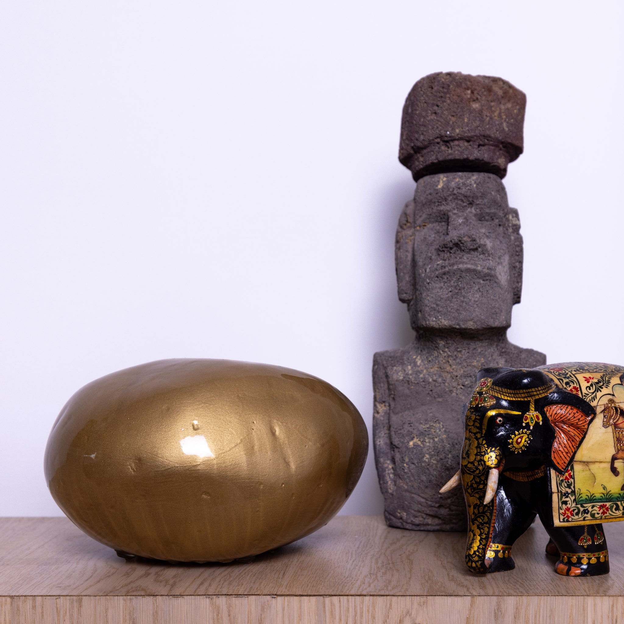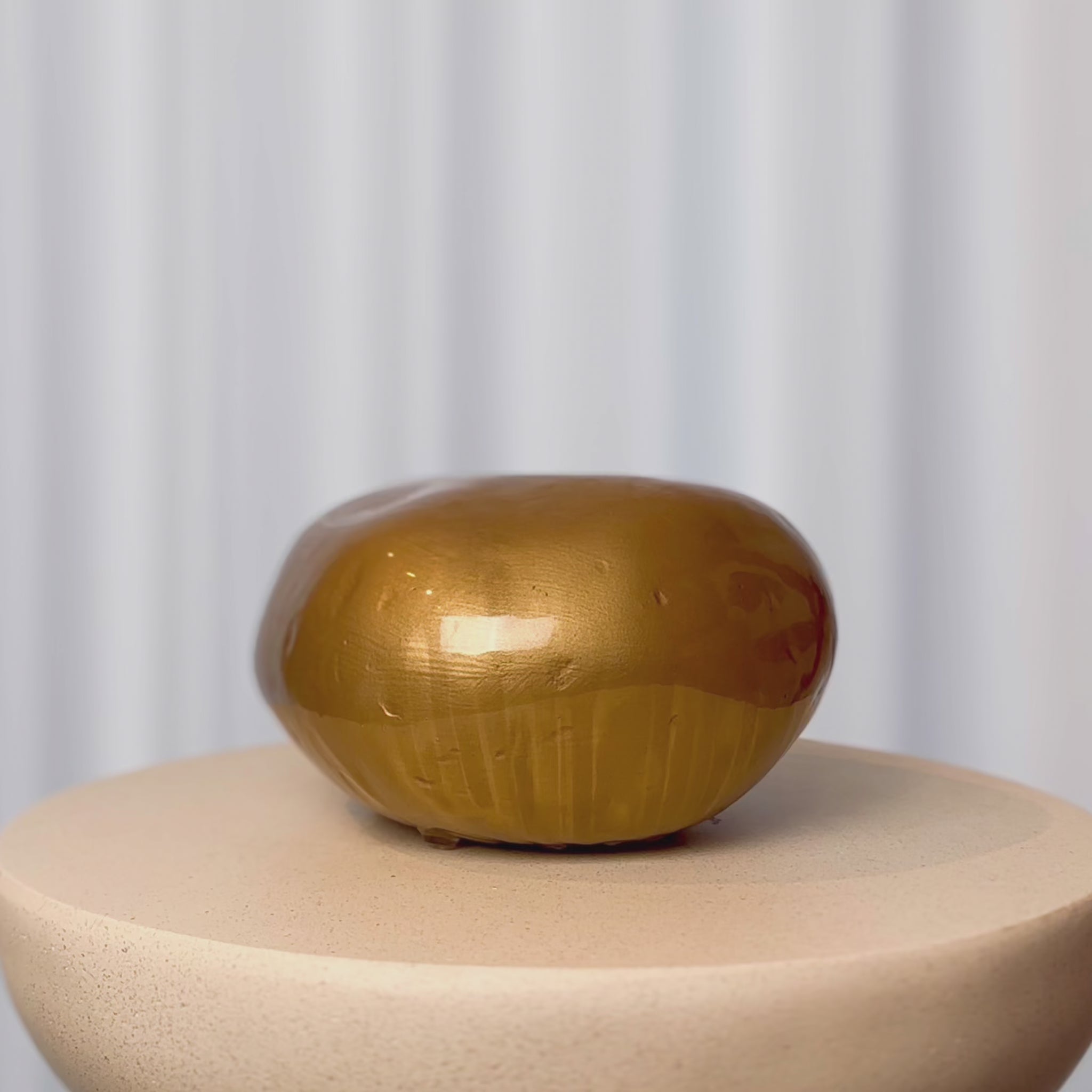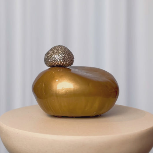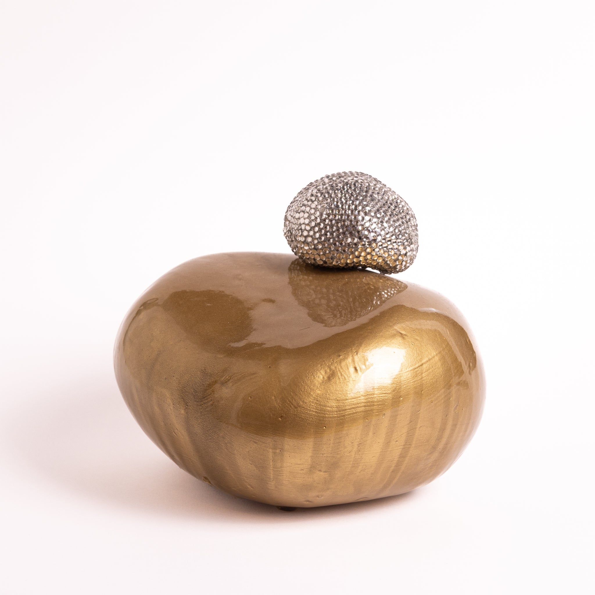 Guld er et skulpturelt værk, der symboliserer menneskets længsel efter det værdifulde og det evige. Den glatte, gyldne form udtrykker både rigdom og ro – et billede på, at ægte værdi ofte findes i enkelheden. Når værket kombineres med Mini Diamant, opstår en fortælling om kontraster: vægt og lethed, overflade og dybde. Sammen minder de os om, at de største skatte sjældent står alene, men opstår i mødet mellem det enkle og det unikke.