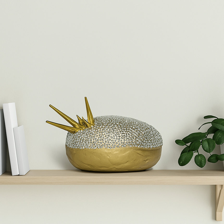 Gylden Krystal – Stor er et skulpturelt værk, der symboliserer menneskets evige søgen efter skønhed og indsigt. De gyldne former og glitrende overflader minder os om, hvordan vi gennem tiderne har søgt det kostbare i verden omkring os – men også i os selv. Værkets 18 pigge understreger, at det, der er ædelt, også værner om sig selv. Gylden Krystal fortæller om styrke, sårbarhed og længslen efter at finde mening og forbindelse i livets kompleksitet. Det er en hyldest til drømmene, vi bærer med os, og de skatte, vi skaber sammen.