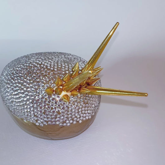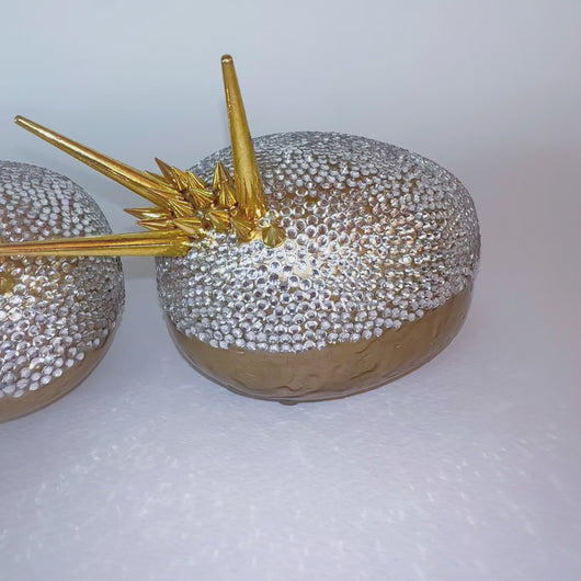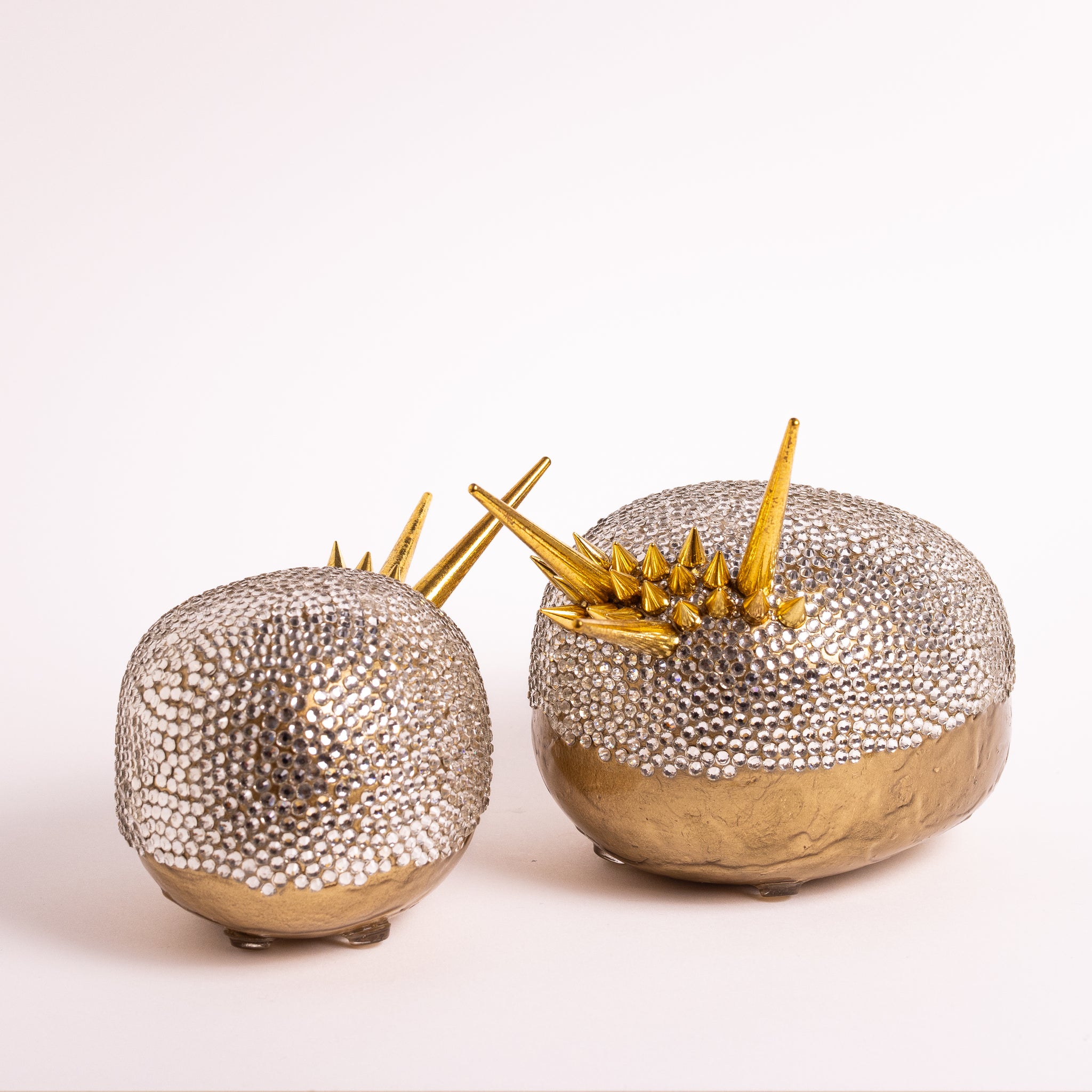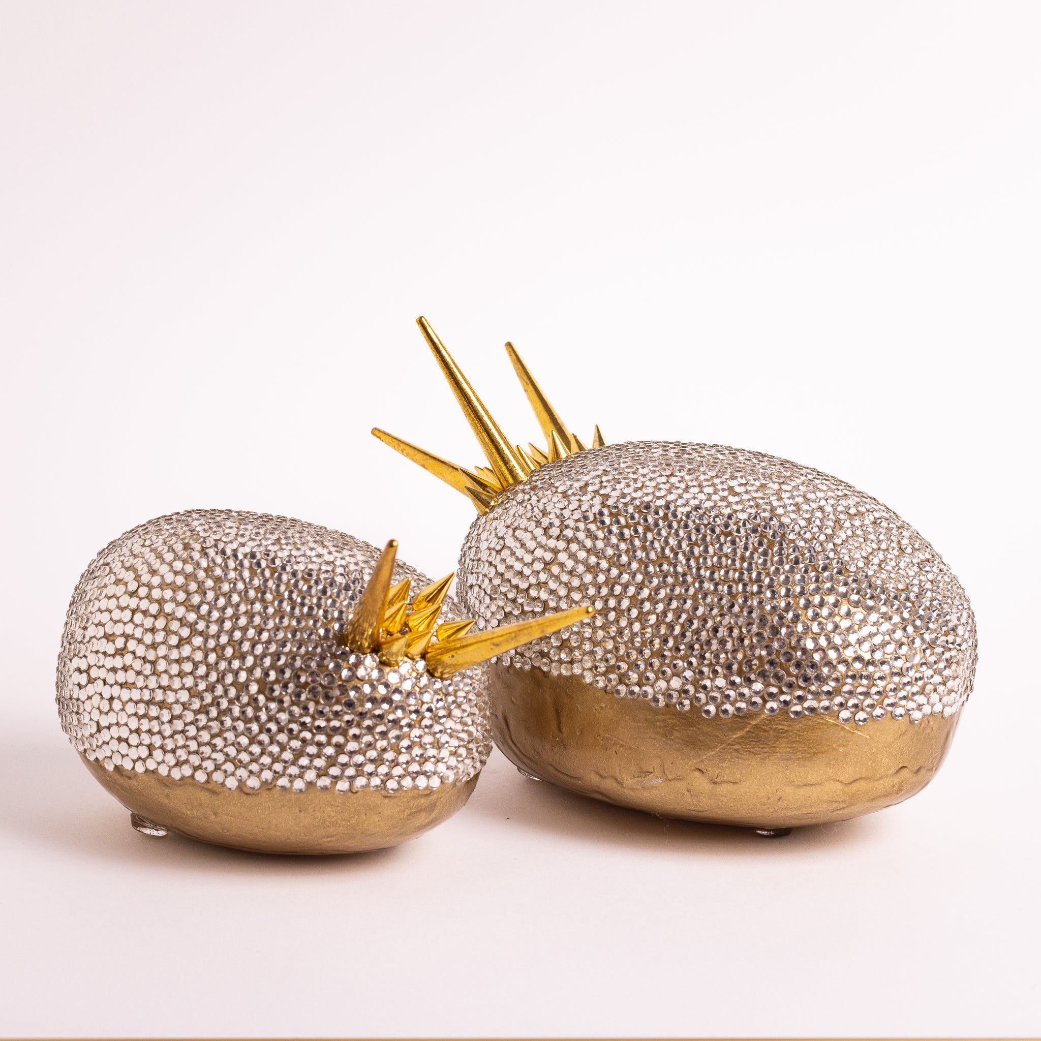 Gylden Krystal – Lille og Stor fortæller sammen en historie om længsel og beskyttelse, styrke og skønhed. De gyldne former og de funklende overflader symboliserer menneskets evige søgen efter mening og det værdifulde. Værkernes pigge minder os om, at det ædle forsvarer sig, men også åbner sig for forbindelse. Sammen udtrykker de, at skatte ikke kun findes i det ydre, men i relationerne og de drømme, vi tør dele.