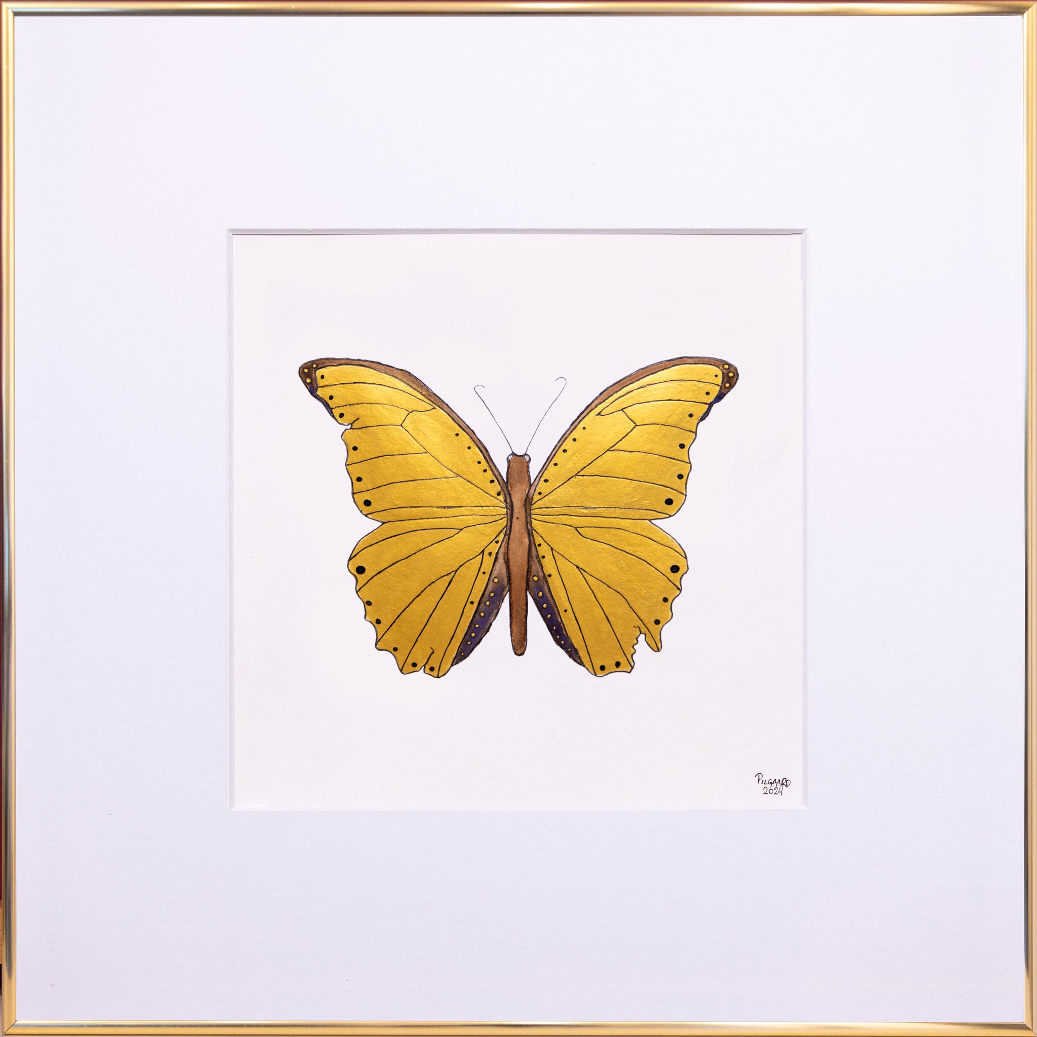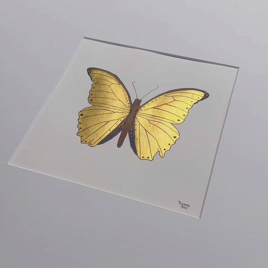 Denne sommerfugl er malet i metalliske farver, der reflekterer lyset. Derudover er den placeret i en guldfarvet aluramme af højeste kvalitet. Denne sommerfugl kommer ikke som kunstprint, og der findes derfor kun denne ene.