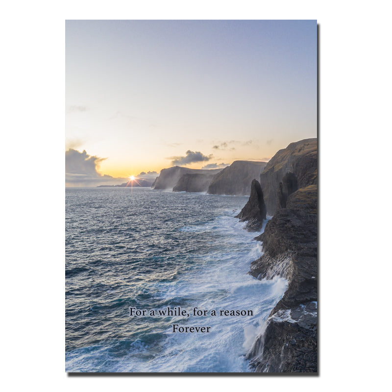 Jord og vand er aldrig uendelige kræfter – de vil for evigt kollidere med hinanden. Mens tidens tand lader bølgerne splitte klipperne fra hinanden, går solen til stadighed ned bag bjergene og farver himlen i ildens nuancer… nok i dag… nok i morgen… nok for altid.