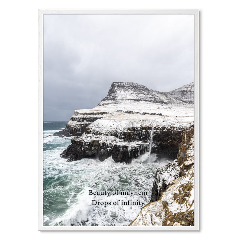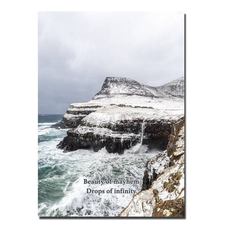 En kaotisk storm slynger sin skønhed mod de ru klipper, mens en stille kilde snor sig vej gennem landskabet, inden det giver slip, langsomt falder og bliver opslugt af evigheden. Dette fotografi er tiltænkt som en påmindelse om, at der kan være noget smukt i alle de sving, som livet byder på.