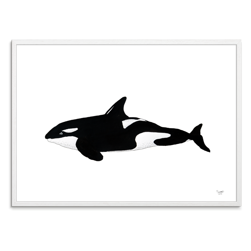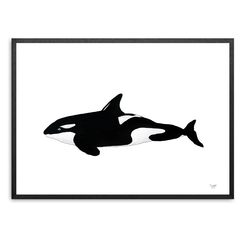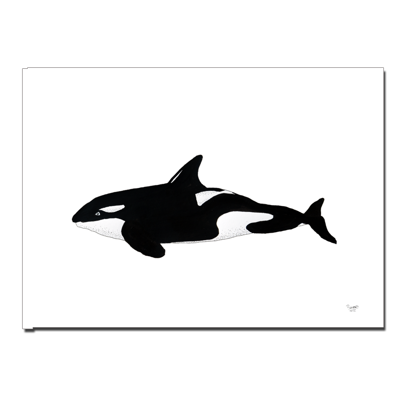 Spækhugger malet i akvarel, der skaber dybe kontraster mellem sort og hvidt - lys og mørke.