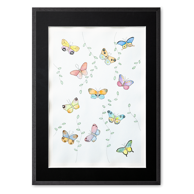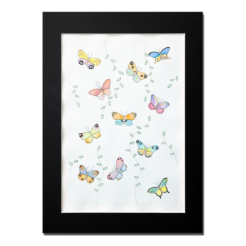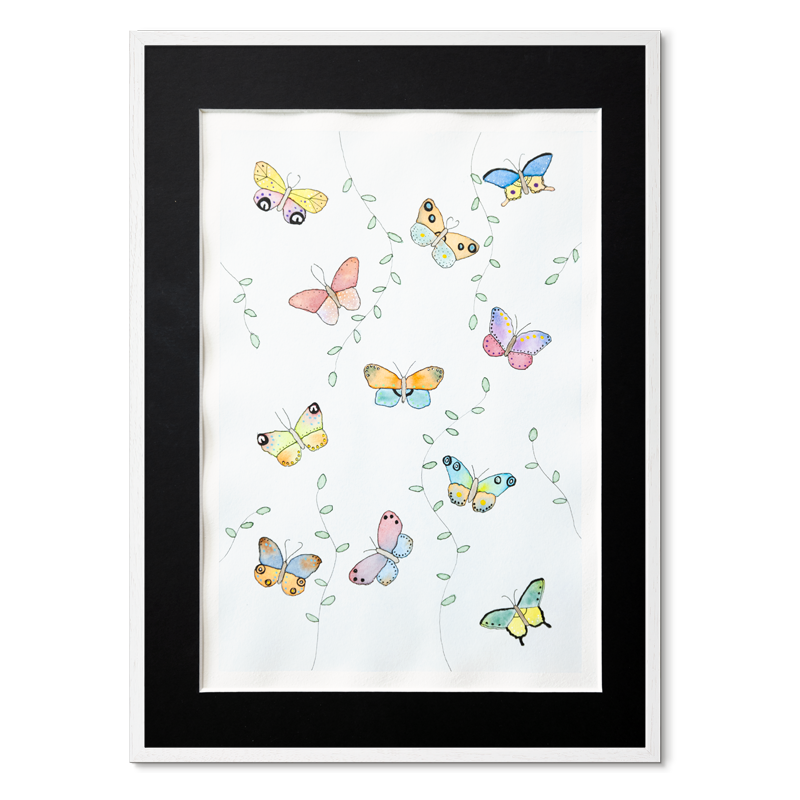 Forårsdag er et sprudlende værk fyldt med små, farverige sommerfugle, der danser hen over papiret som et levende forårskys. Hver sommerfugl er en lille fejring af liv, lethed og fornyelse – sammen skaber de en stemning af håb og glæde.