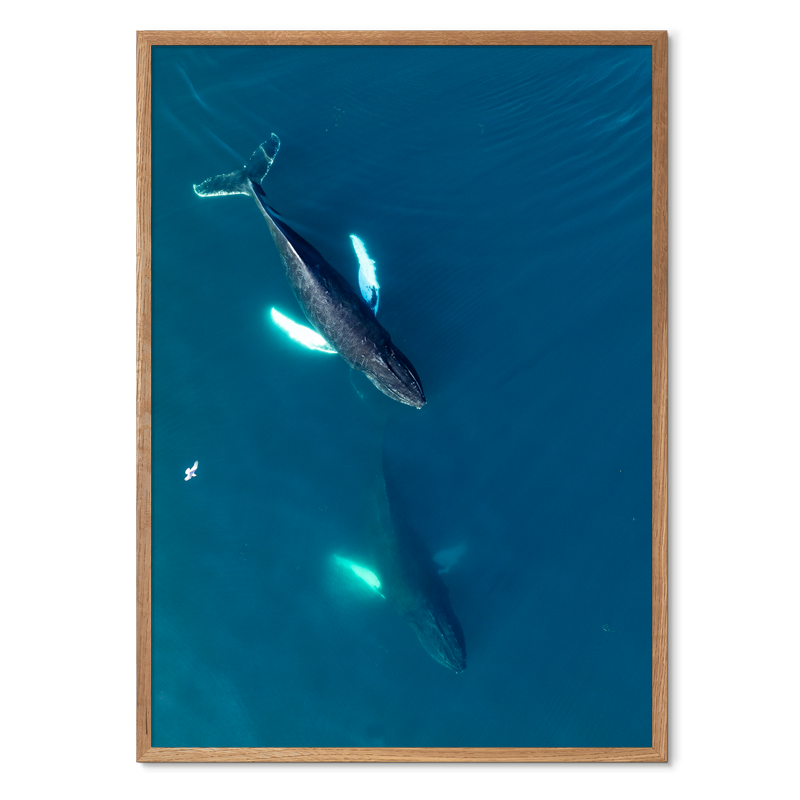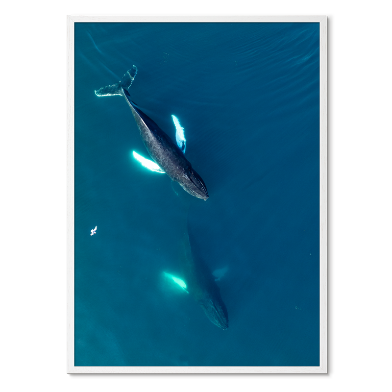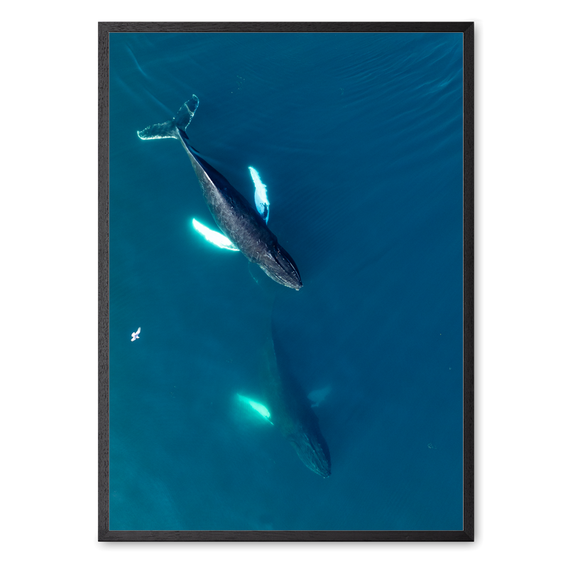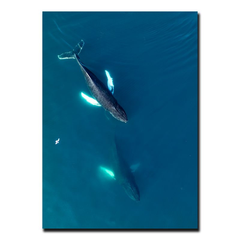 Dive into the collection 'Singers of the Sea', a series of photographic works capturing the fascinating world of the humpback whale. The humpback is known for its unique song—a melody that fills the oceans with enchanting tones. These songs, often made up of complex and repetitive patterns, are used to communicate and connect whales across great distances and have fascinated scientists and nature lovers for years.