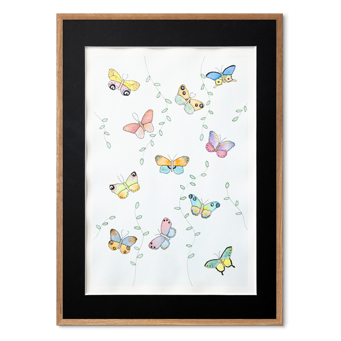 Sommerfuglene er skabt med bløde penselstrøg på kraftigt papir. De symboliserer hver især den kraft, der inden i os; forårets komme og nye spændende eventyr, der lurer i horisonten. Sommerfuglene er indrammet i massive egetræsrammer og signeret samt dateret.