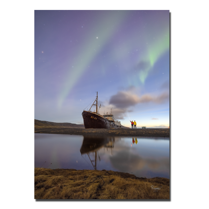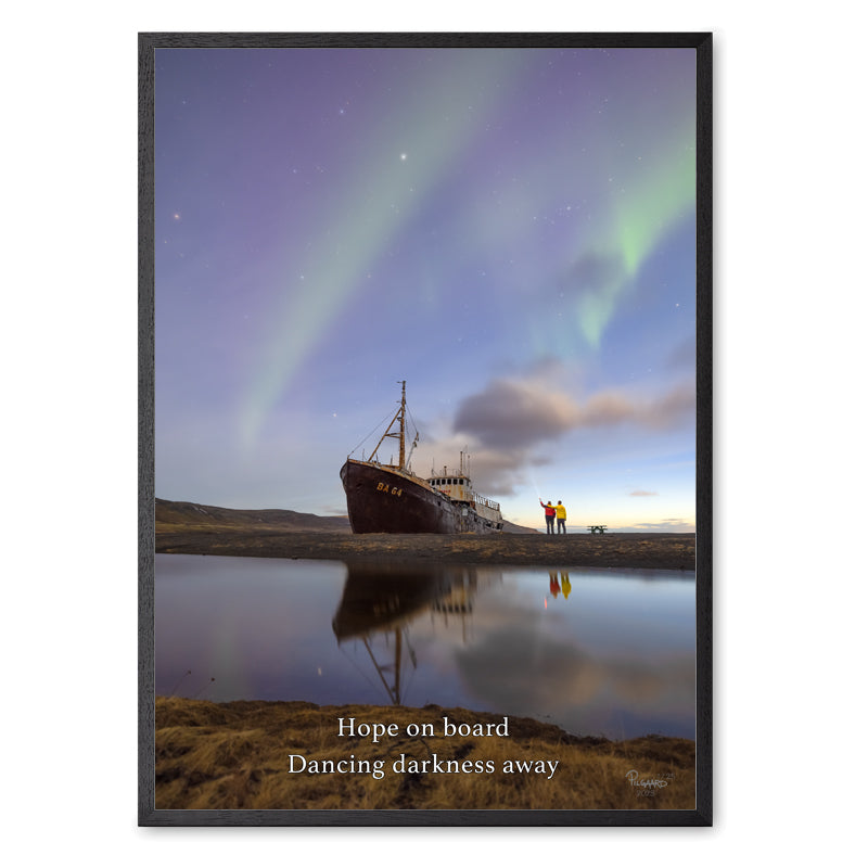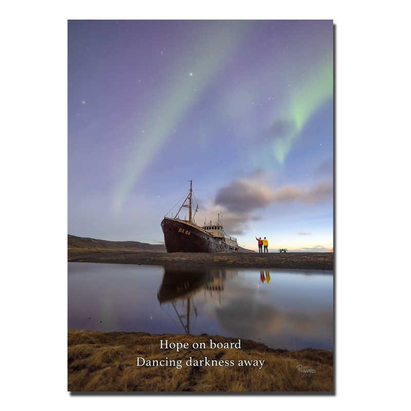 Dette fotografi er taget få kilometer fra Europas vestligste punkt i Islands vestfjorde. Skibsvraget er landets ældste stålskib. I dag ligger skibet, der hedder Garðar, ensomt i mørket og efterladt på en øde strand. Sømændene har forladt det, men dets sjæl lever for evigt. Da Hans og Jobbe besøgte skibet for at fotografere det, var der så mørkt, at kun lige stjernerne oplyste natten. Da Jobbe havde indstillet kameraet og var klar til at tage billeder, gik de to over mod skibet. Og i samme sekund, som de var klar til at blive fotograferet, eksploderede himlen med nordlys. Det varede kun få minutter, men lige der; i det øjeblik, var der mere håb ombord i hjerterne end nogensinde. Lyset kommer, hvis vi leder efter det. Og nogle gange skal der lys og lygte til for at se det.